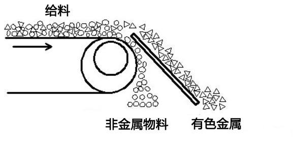 工作時(shí)隨著磁滾筒的快速旋轉(zhuǎn),在分選滾筒表面產(chǎn)生高頻交變的強(qiáng)磁場,當(dāng)導(dǎo)體經(jīng)過磁場時(shí),會在其內(nèi)部產(chǎn)生渦電流,此渦電流本身會產(chǎn)生與原磁場方向相反的磁場,有色金屬(如銅、鋁等)則會因磁場的排斥力作用而沿其輸送方向向前飛躍,實(shí)現(xiàn)與其它非金屬類物質(zhì)的分離,達(dá)到分選的目的;其主要區(qū)分判據(jù)是物料導(dǎo)電率和密度的比率值,比率值高的較之比率低的物料更易分離。